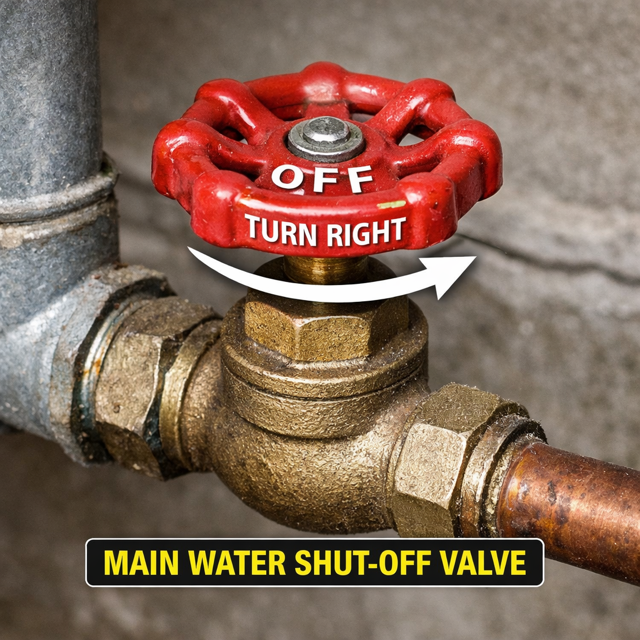 β’ Locate your main water shut-off valve (usually outside, garage, or utility room)