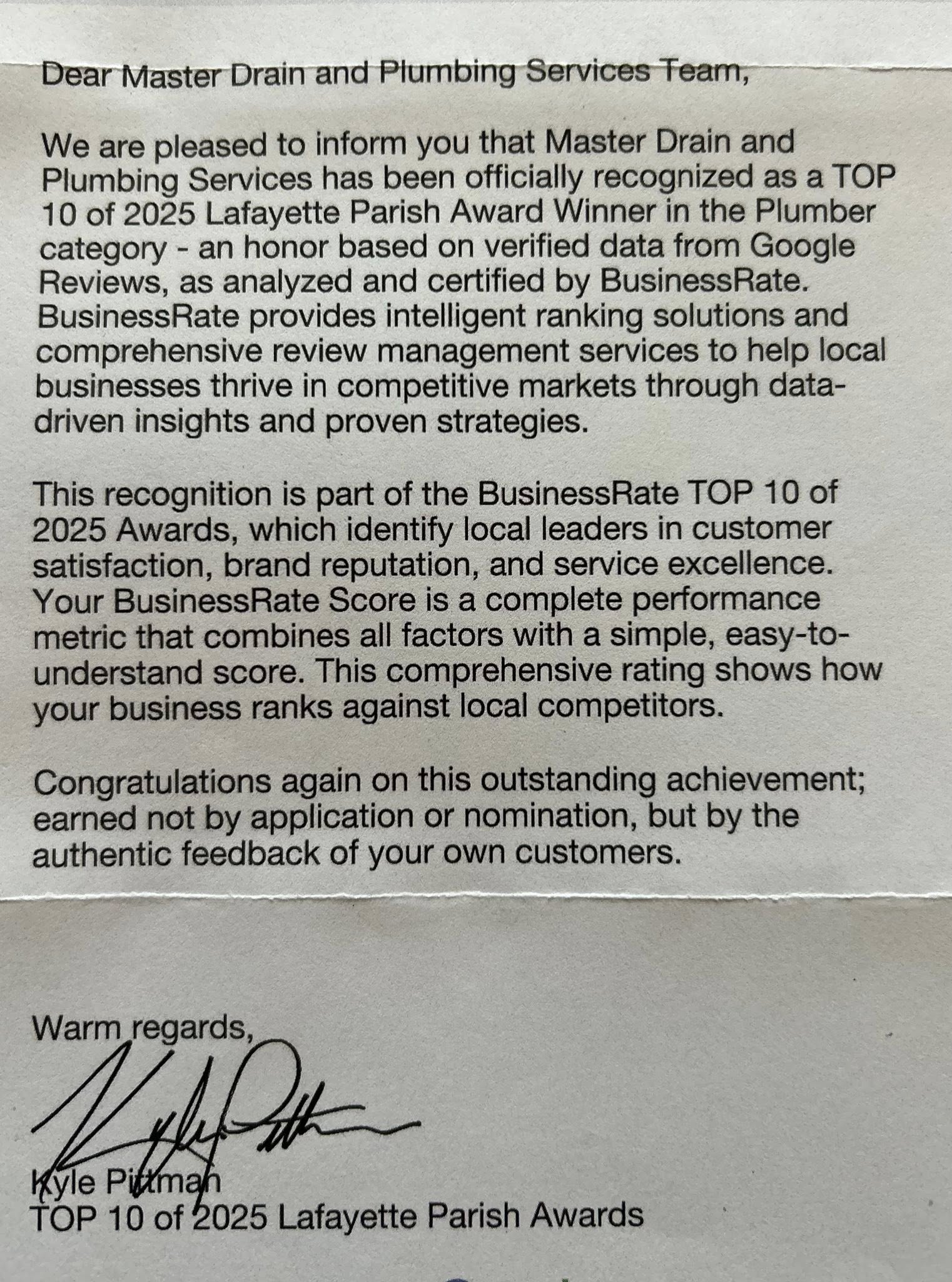 We are proud to announce that Master Drain and Plumbing Services has been officially recognized as a TOP 10 Plumber in Lafayette Parish, based on verified Google reviews and client satisfaction.